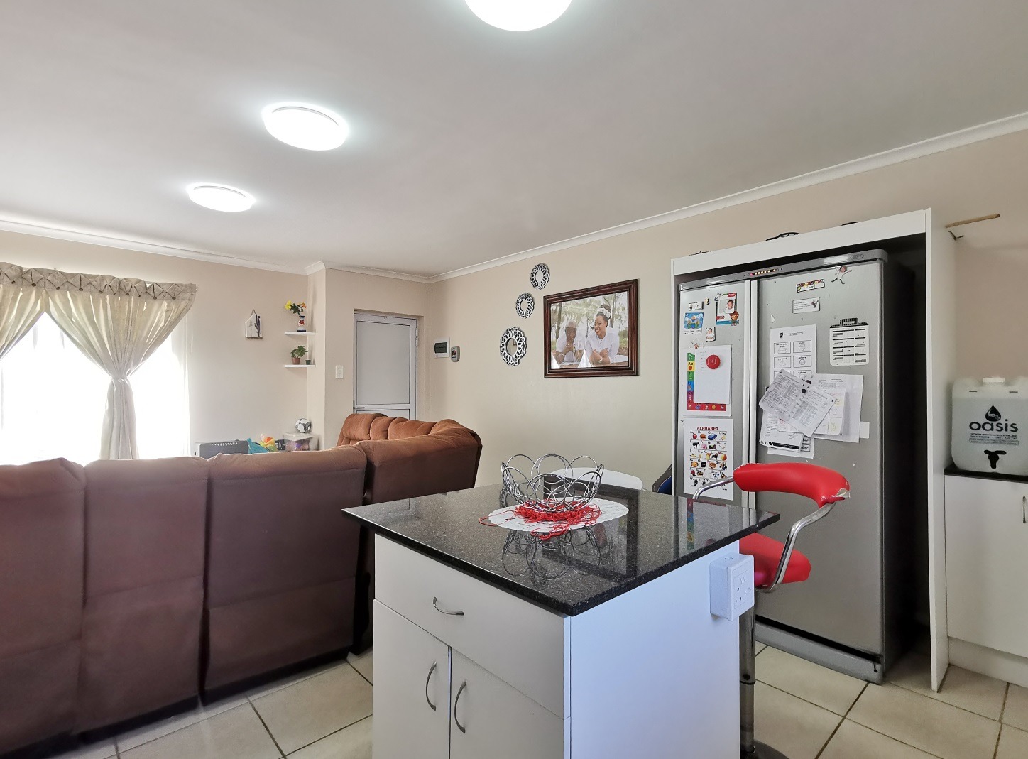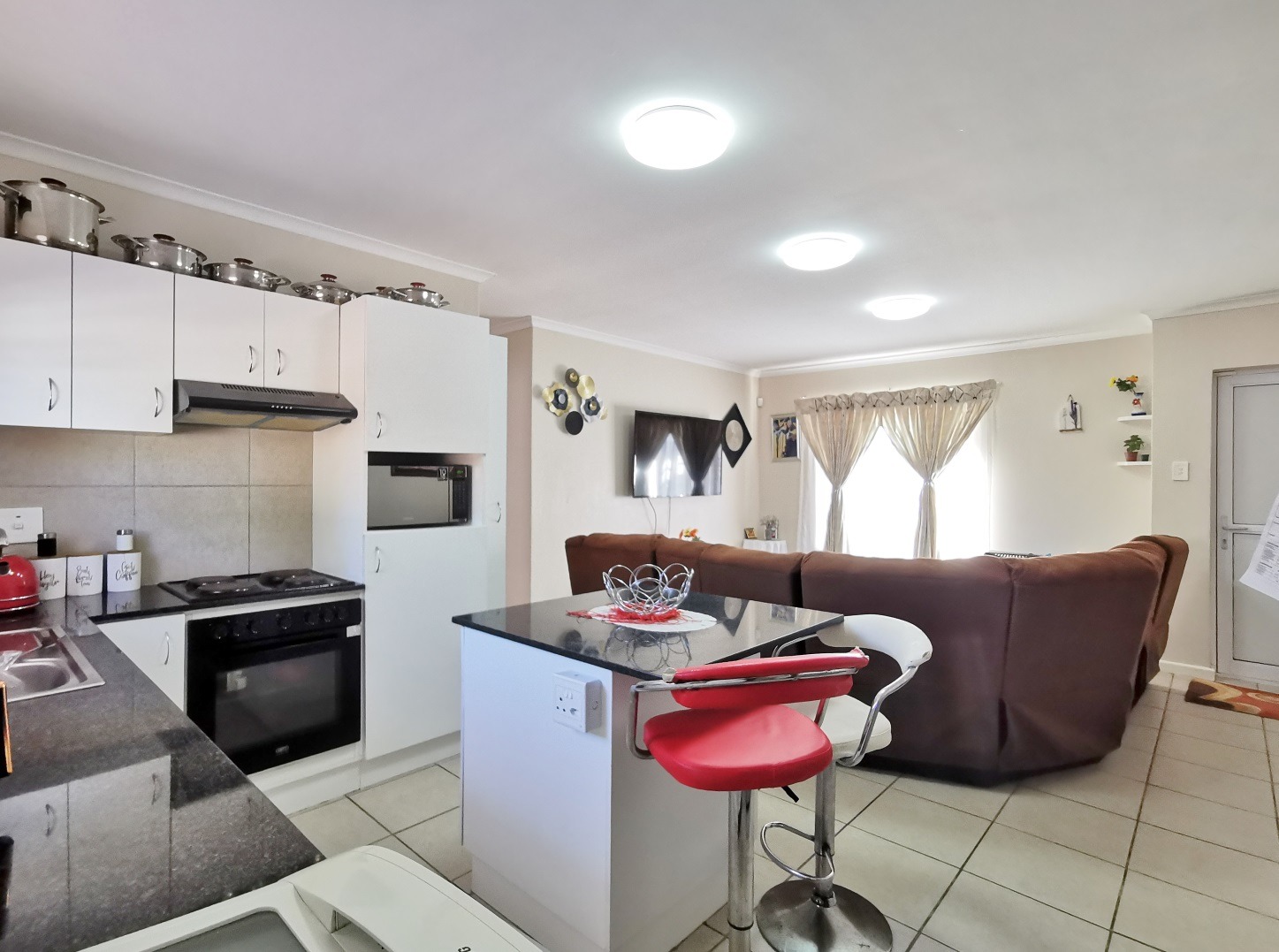 Open plan fitted kitchen leading onto lounge area
