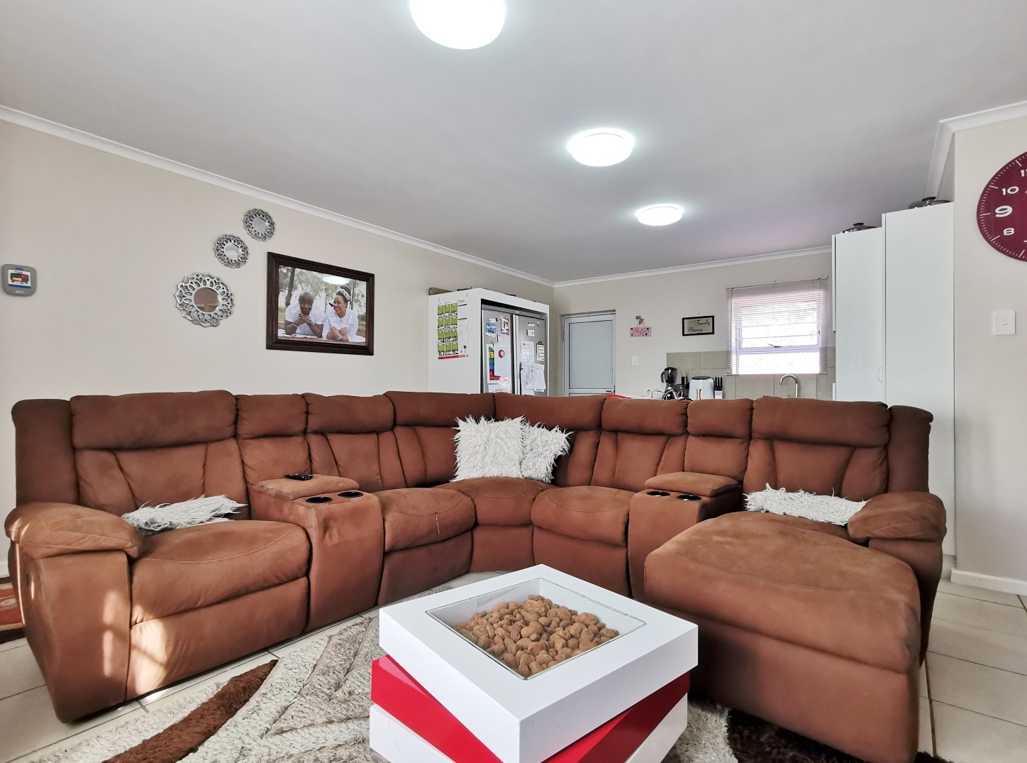 Open plan fitted kitchen leading onto lounge area