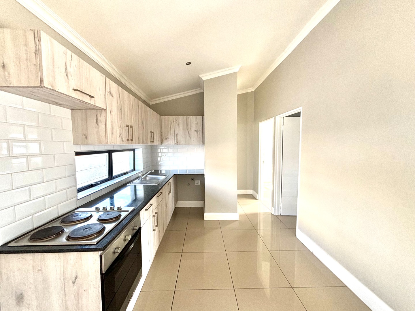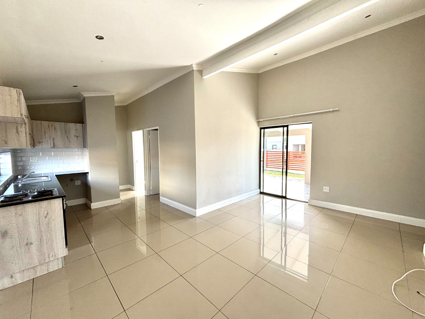 Open plan fitted kitchen leading onto lounge area