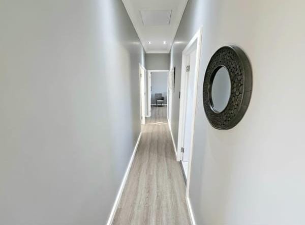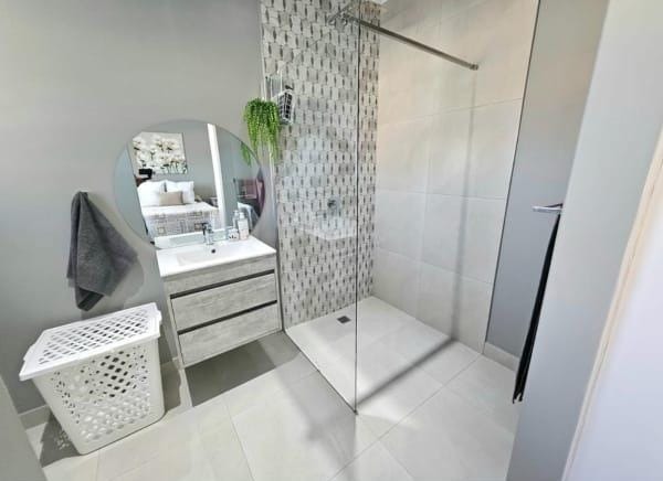 The property features three well-appointed bedrooms, each designed with comfort and style in mind. Light grey walls and wood laminate flooring continue the contemporary theme, complemented by good natural light from large windows. The main bedroom includes built-in wardrobes and convenient en-suite access to one of the two modern bathrooms. A dedicated family TV room offers additional versatile living space.
