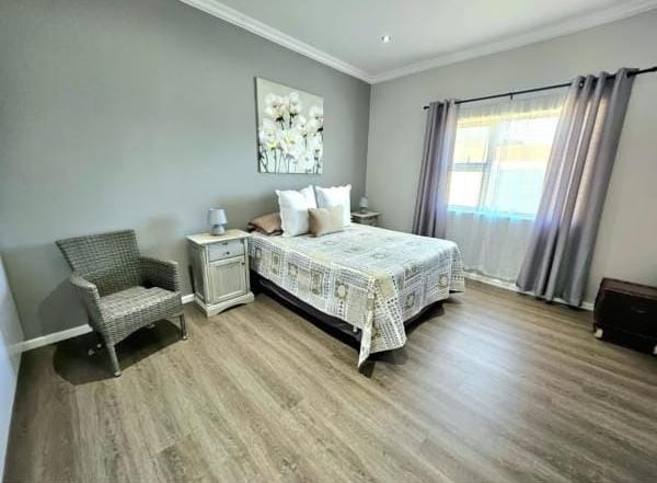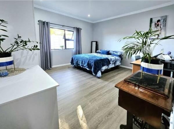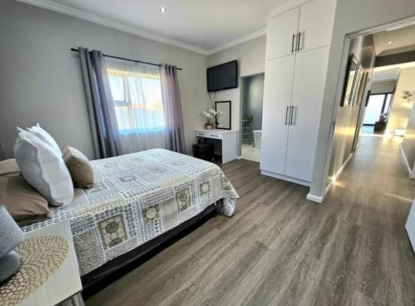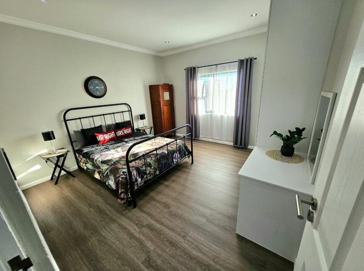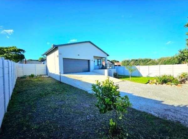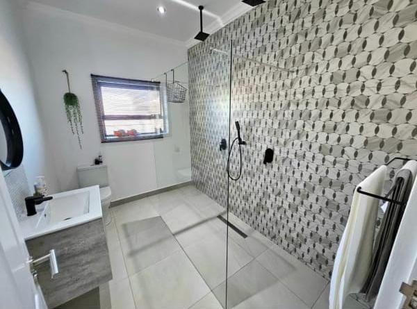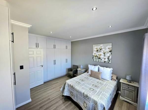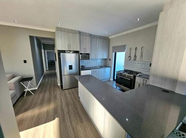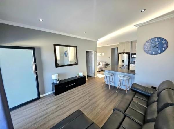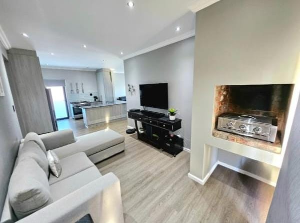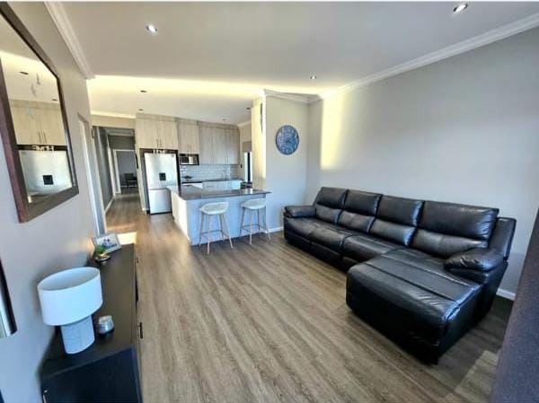 This modern 3-bedroom, 2-bathroom residence in Port Elizabeth offers a contemporary living experience. The heart of the home is its open-plan living and kitchen area, designed for seamless interaction and entertaining. The kitchen boasts sleek light wood cabinetry, dark countertops, a subway tile backsplash, and stainless steel appliances, including a gas range. An island with bar seating provides a casual dining spot, while the adjacent lounge area, featuring a large sectional sofa and a built-in braai, creates a welcoming space for relaxation and gatherings. Consistent wood-look laminate flooring and recessed lighting enhance the modern aesthetic throughout.