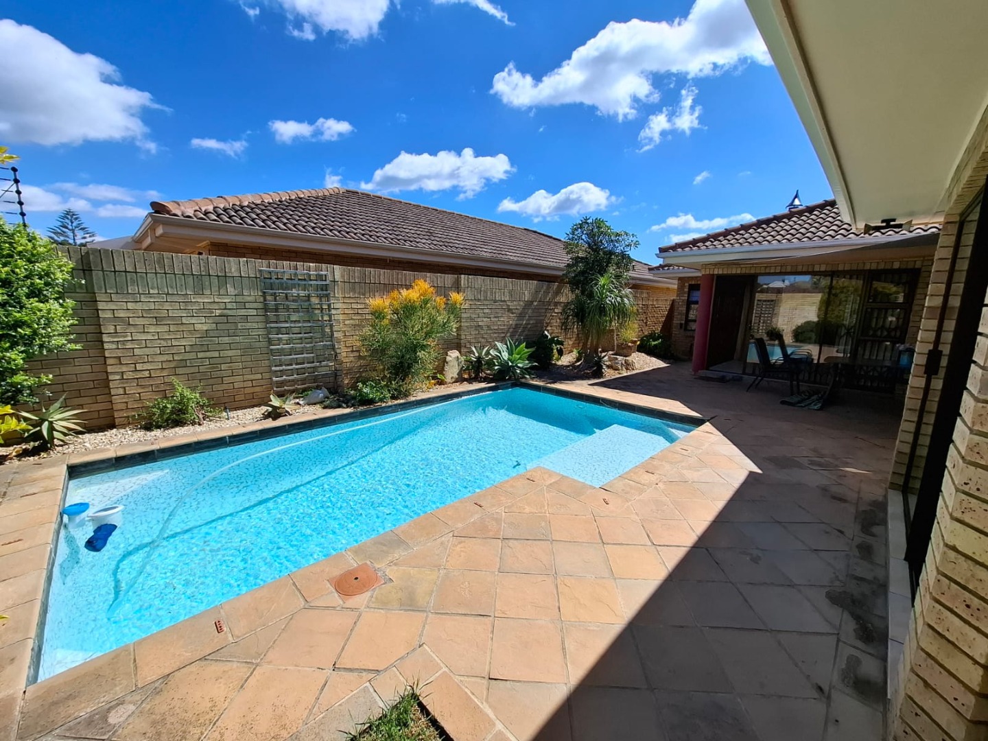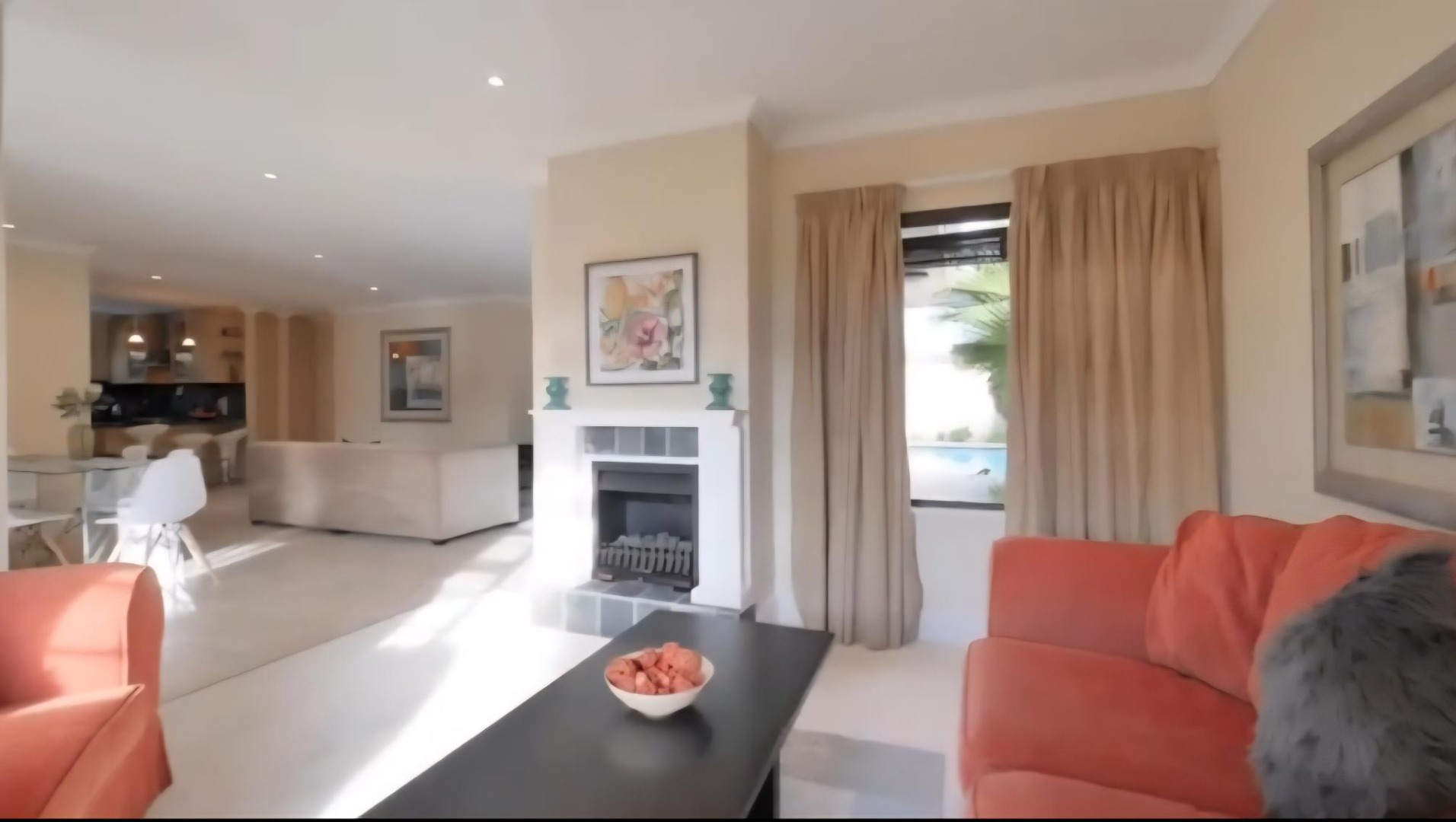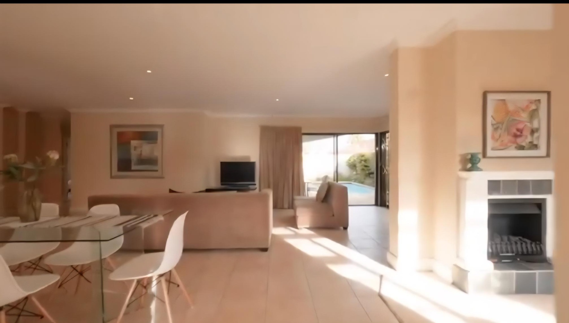 The open-plan living and dining areas flow seamlessly through sliding doors to a covered patio and sparkling pool area, creating the perfect indoor-outdoor entertainment space.