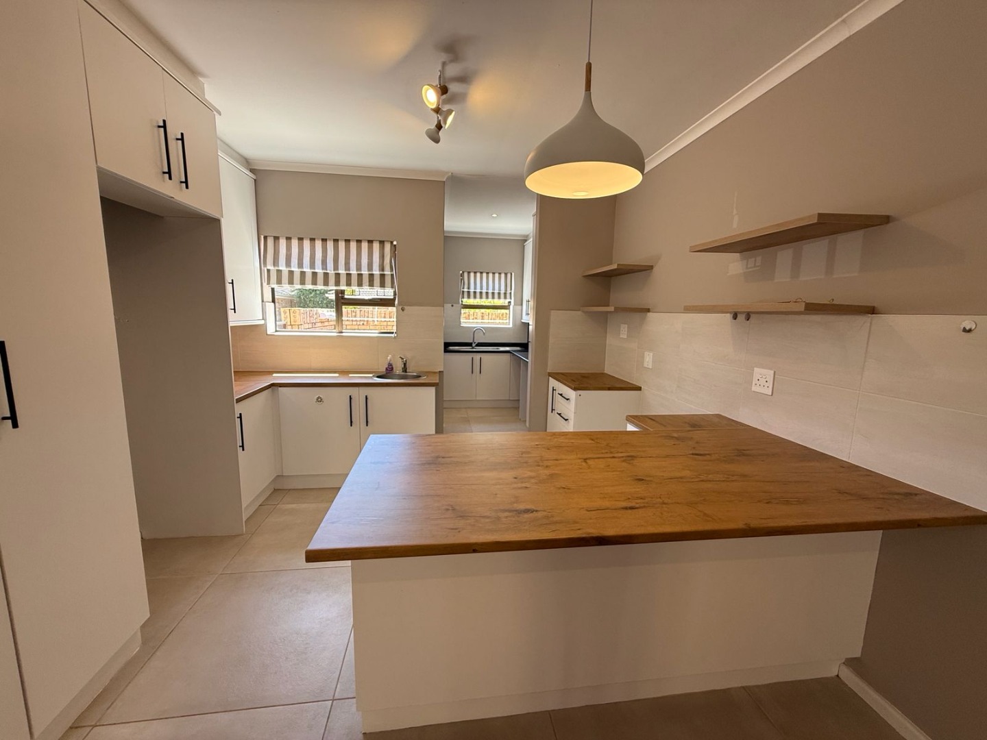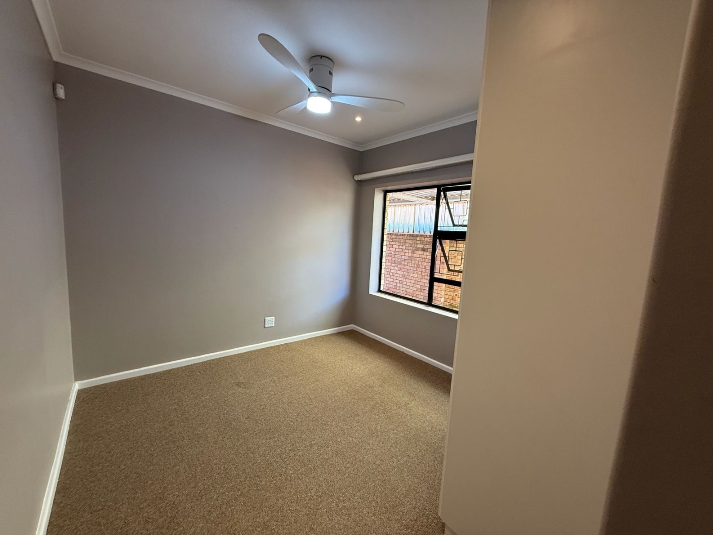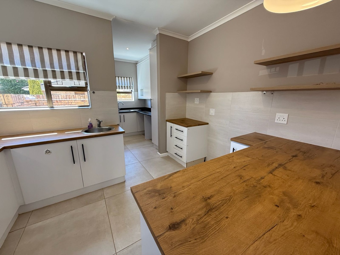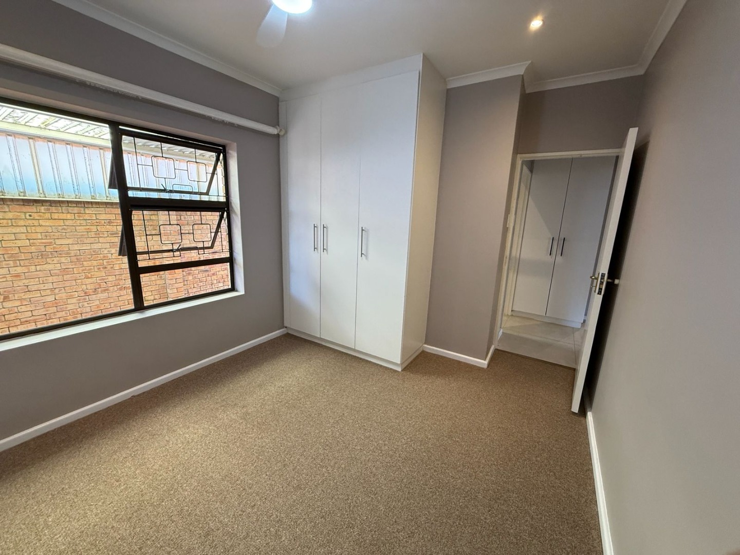This modern 3-bedroom offers comfortable living within a secure complex in Walmer Downs, Port Elizabeth. The property features a spacious open-plan living area, tiled flooring, lighting, and newly painted walls.