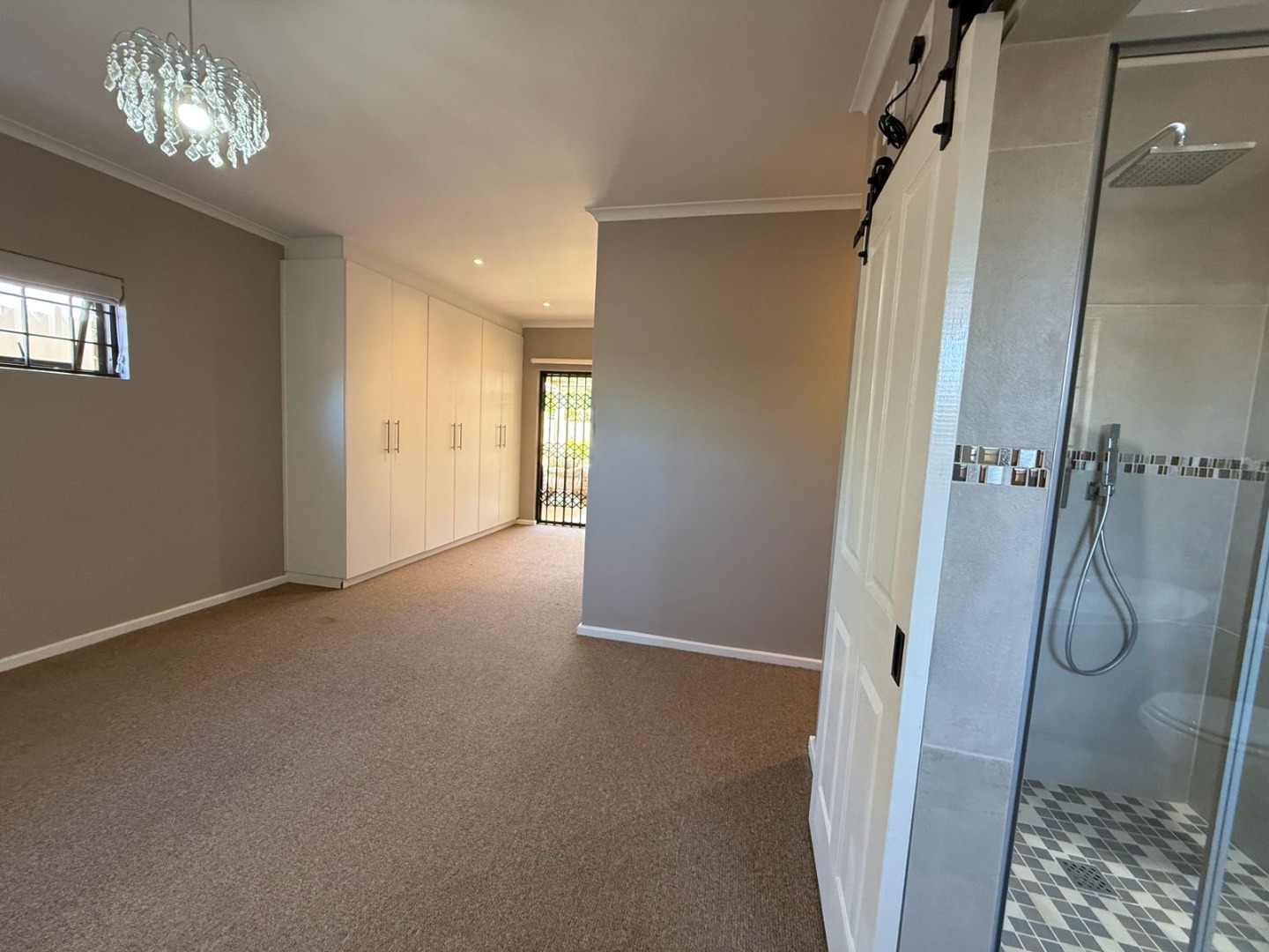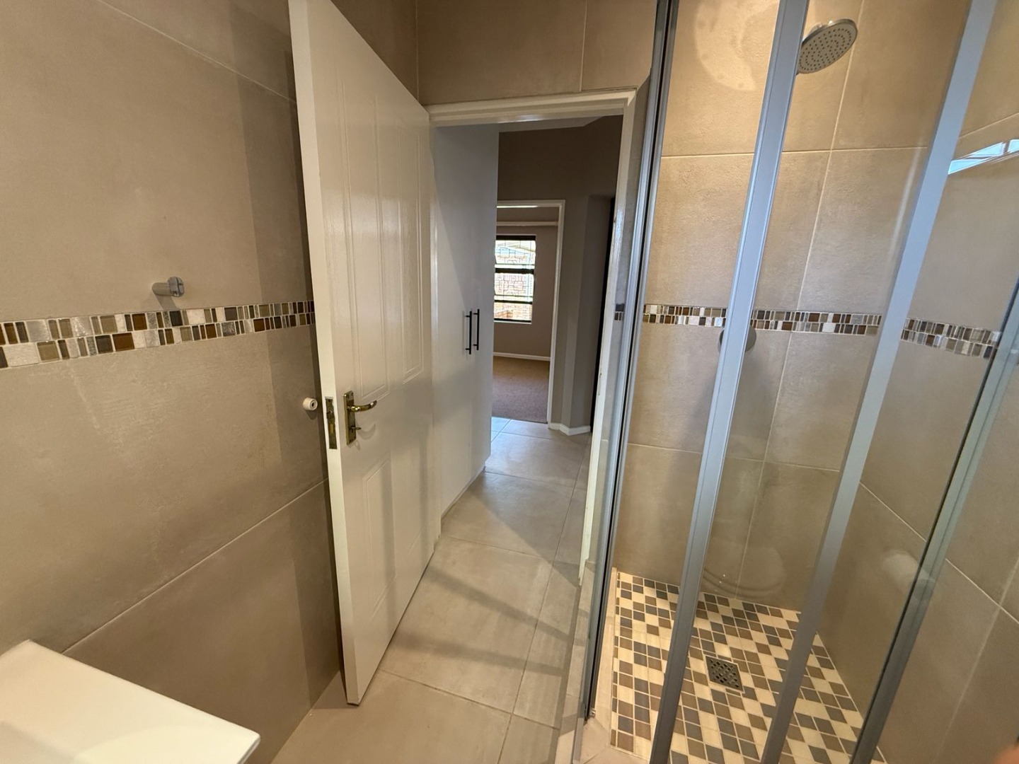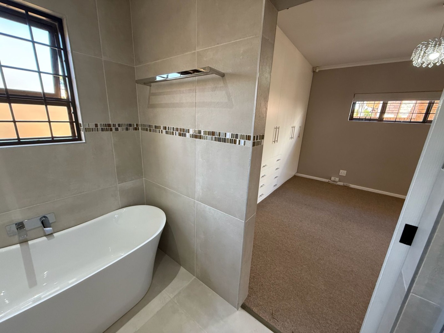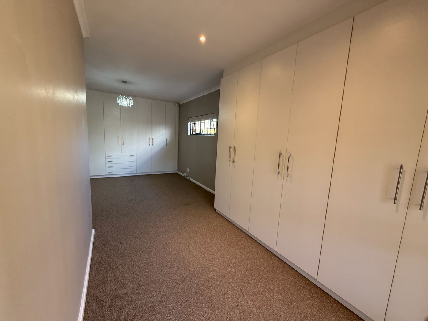 This modern 3-bedroom offers comfortable living within a secure complex in Walmer Downs, Port Elizabeth. The property features a spacious open-plan living area, tiled flooring, lighting, and newly painted walls.