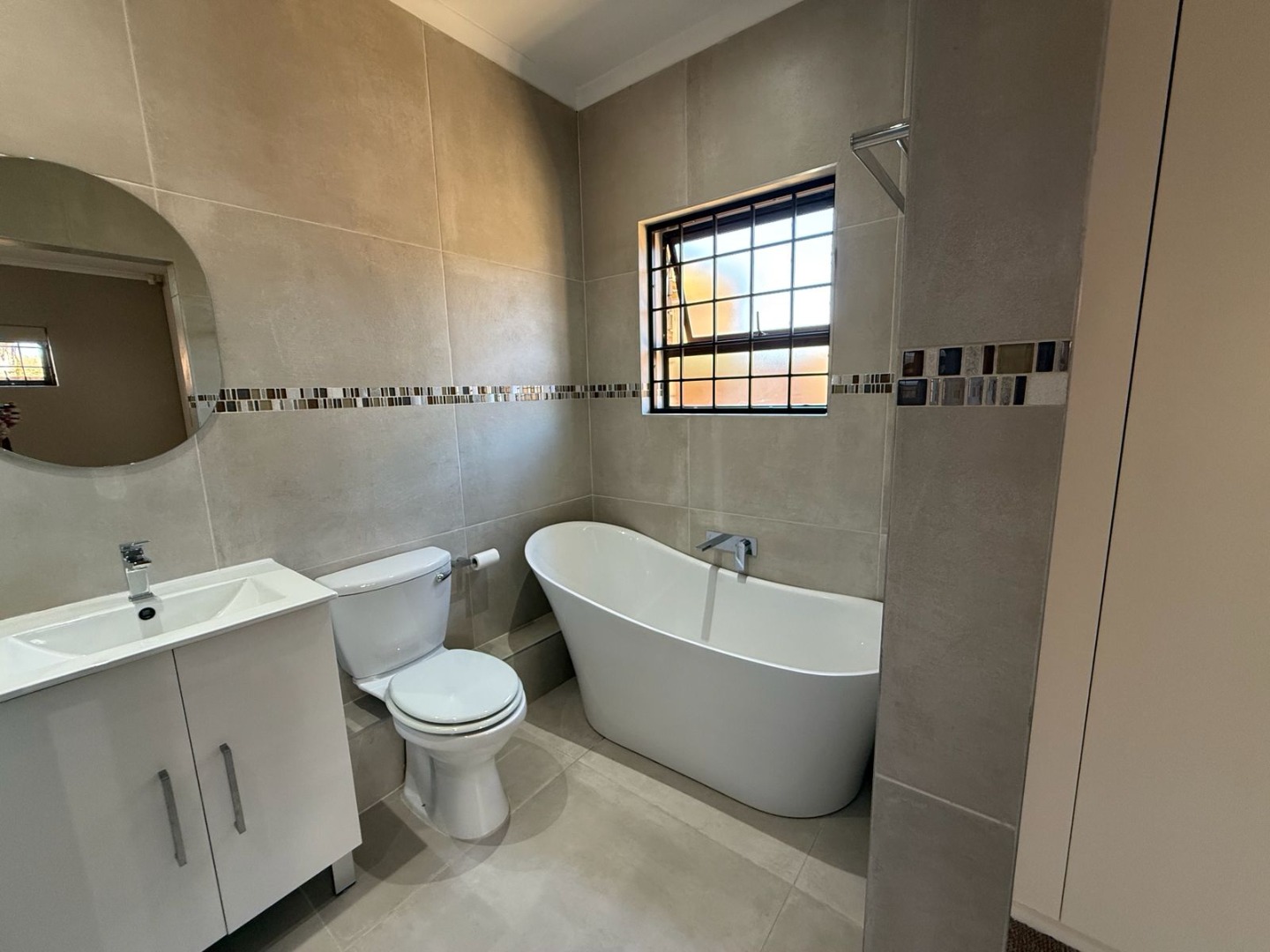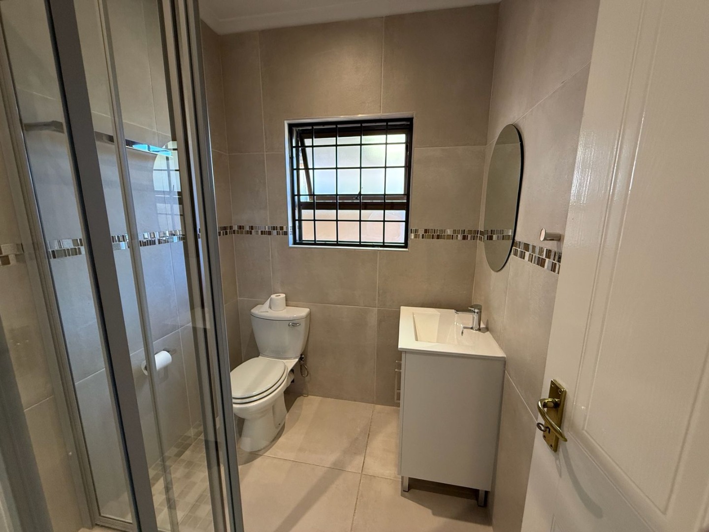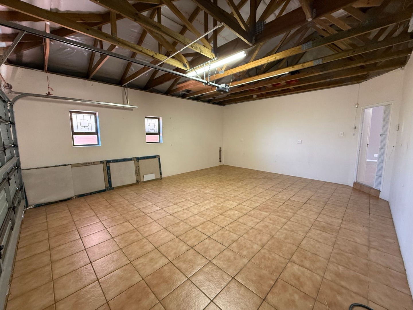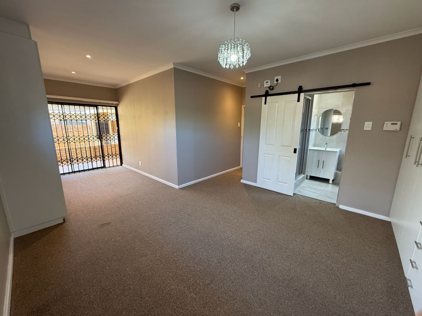 This modern 3-bedroom offers comfortable living within a secure complex in Walmer Downs, Port Elizabeth. The property features a spacious open-plan living area, tiled flooring, lighting, and newly painted walls.