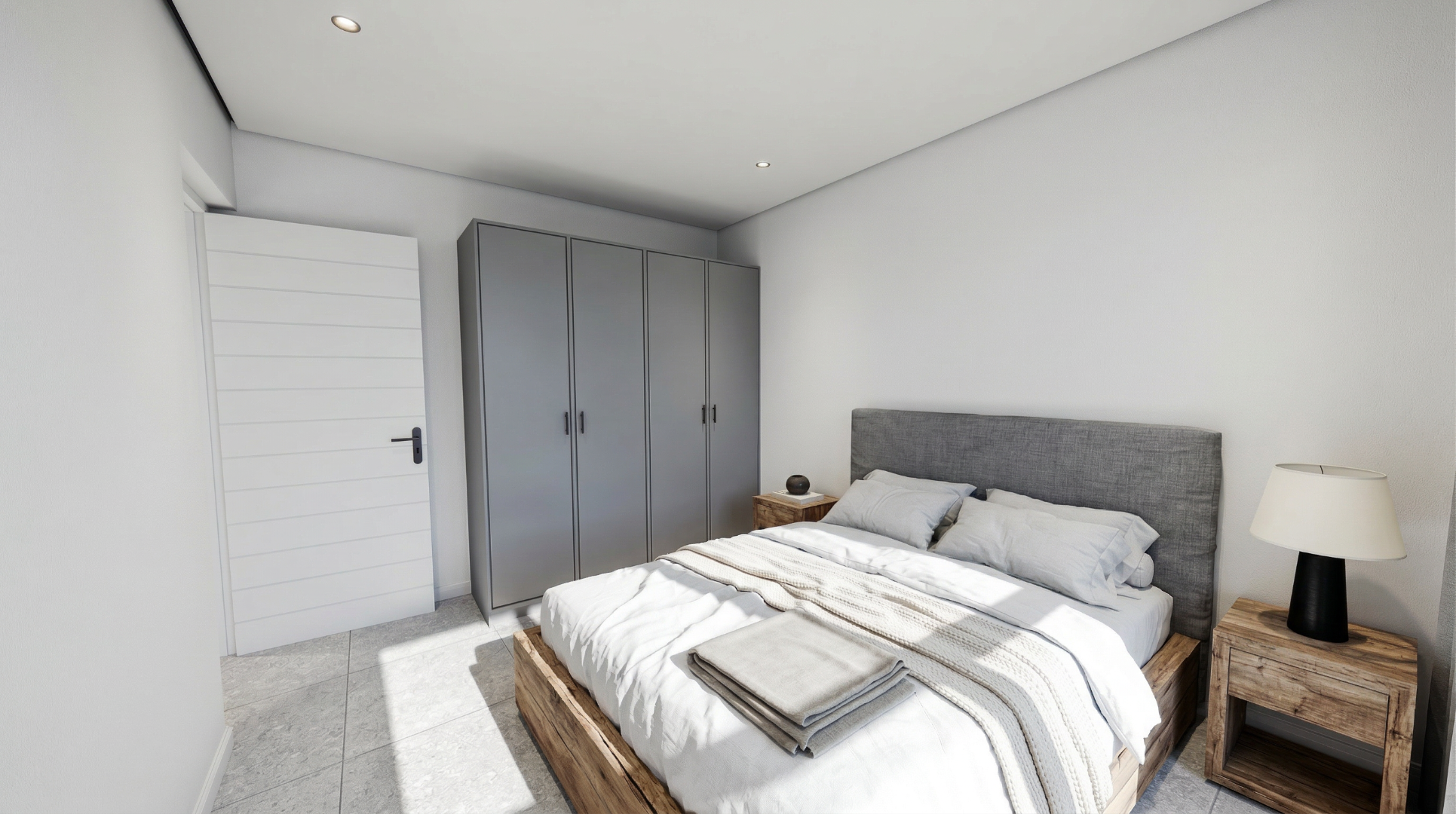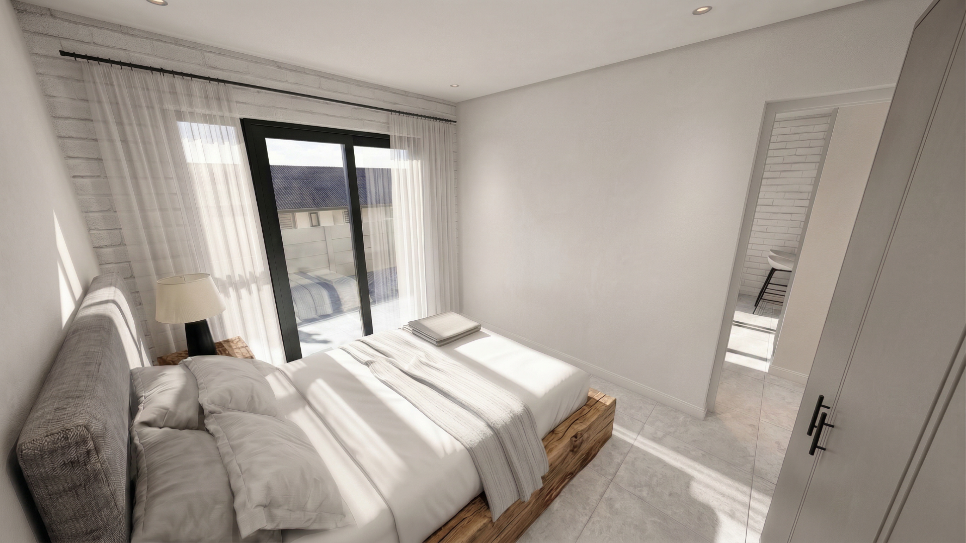 The open-plan kitchen flows into the living area, leading out to a covered patio with built-in braai, creating a functional and welcoming space ideal for everyday living or entertaining. Two well-sized bedrooms are serviced by a modern bathroom.